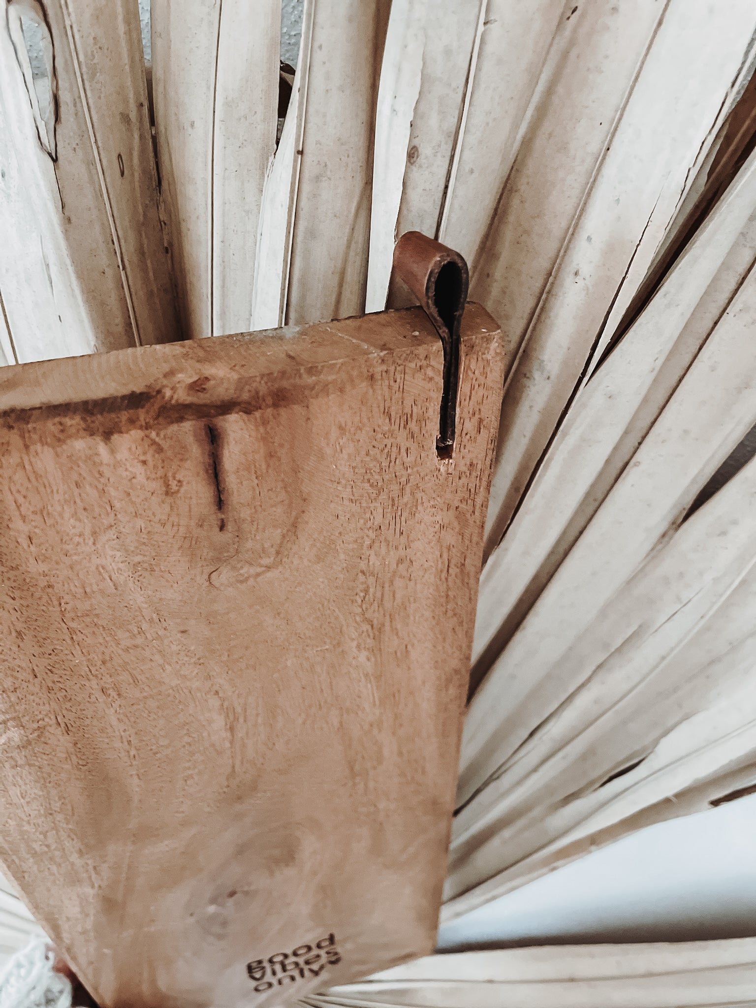 Dieses Brettchen, aus robustem Mangoholz gefertigt, ist mit einer auffälligen Lederschlaufe versehen und verfügt über eine Gravur mit dem Motto "Good vibes only".
