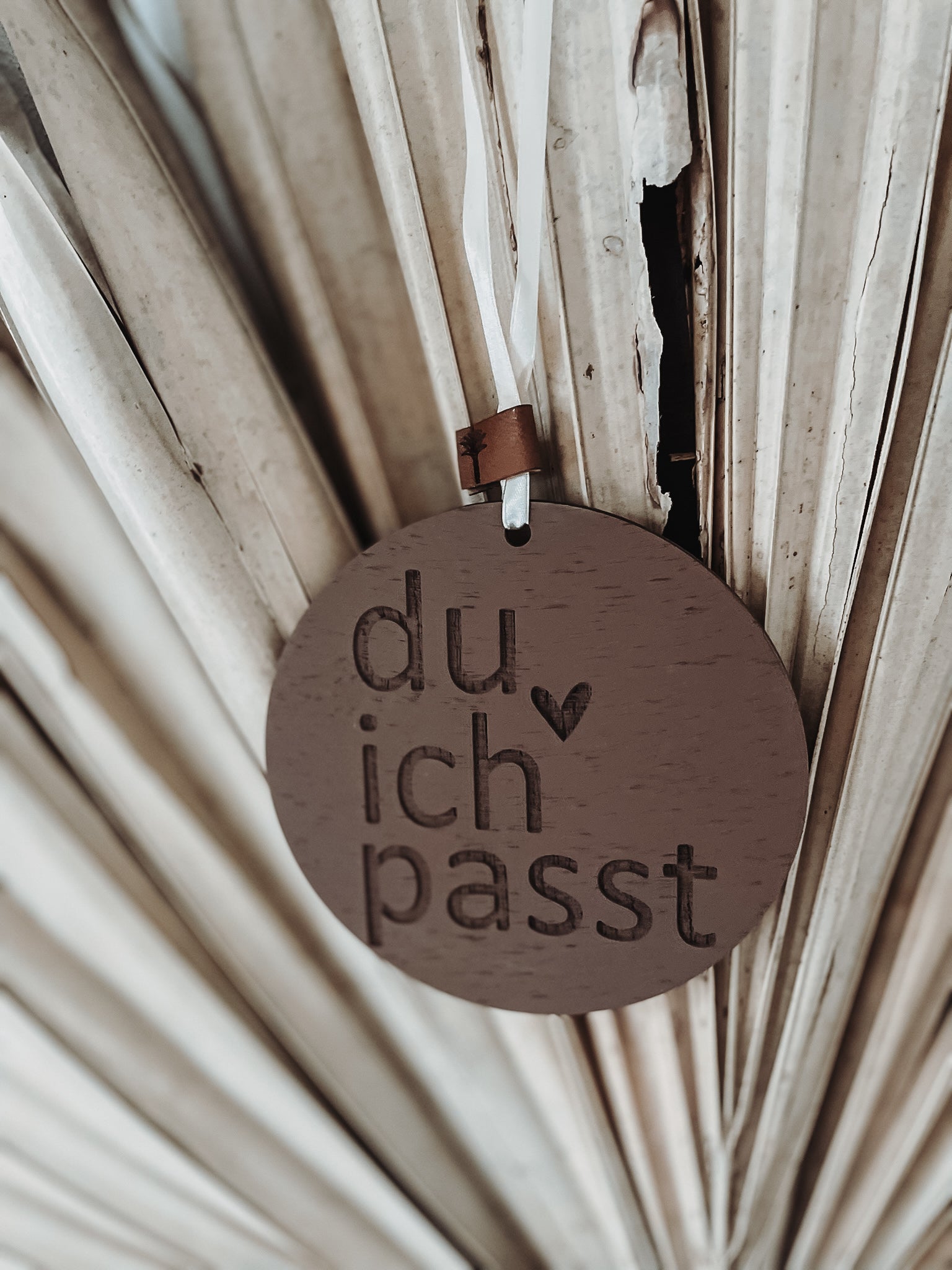 Diese Textplatte aus Holz mit dem eingravierten Schriftzug 'du ich passt' ist eine schlichte und doch besondere Art, einem ganz besonderen Menschen zu zeigen, wie gut ihr zusammenpasst. Perfekt zum Aufhängen als Dekoration oder als persönliches Geschenk.