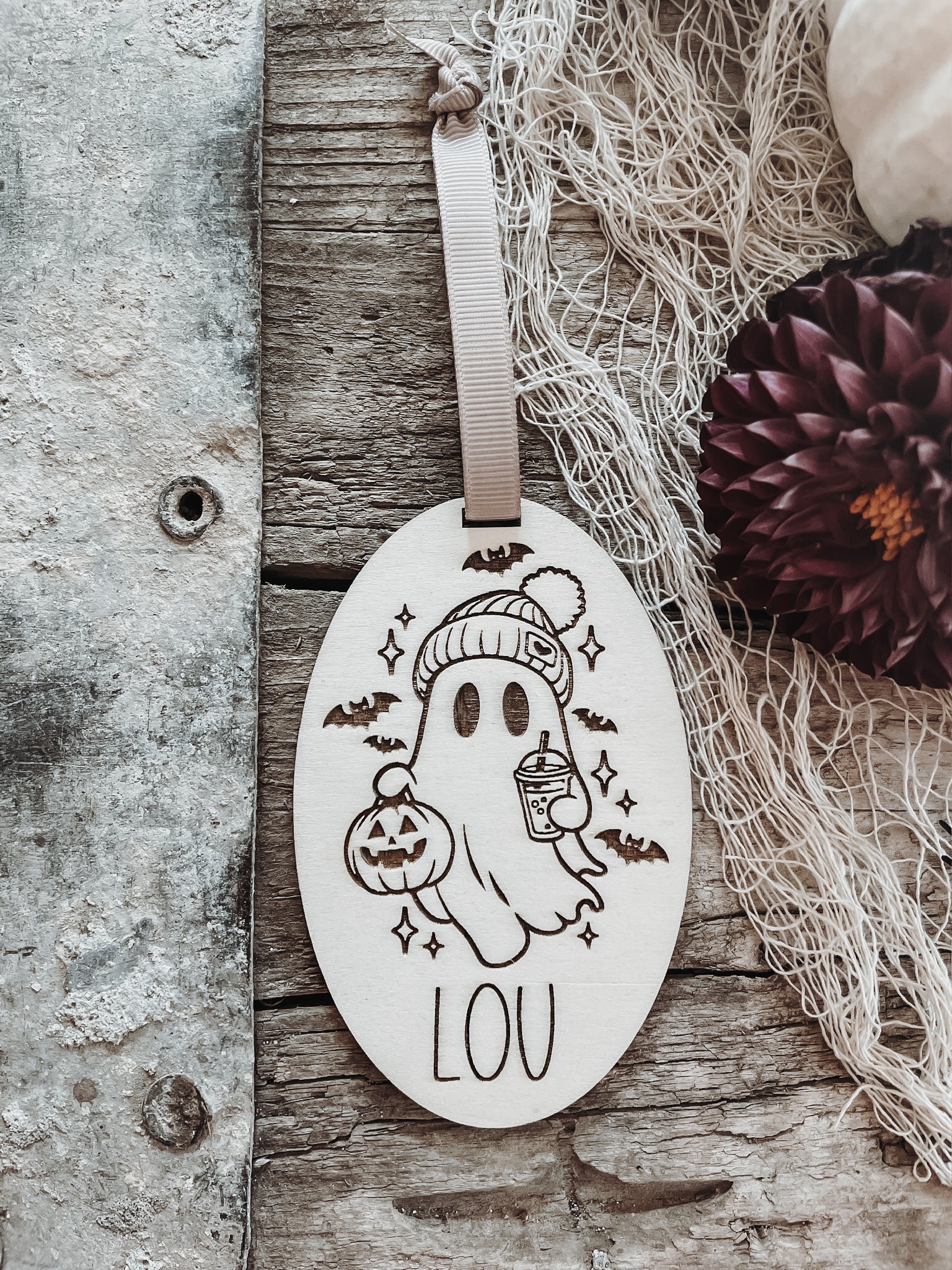 Personalisierte Holzanhänger für deine nächste Halloween-Party.