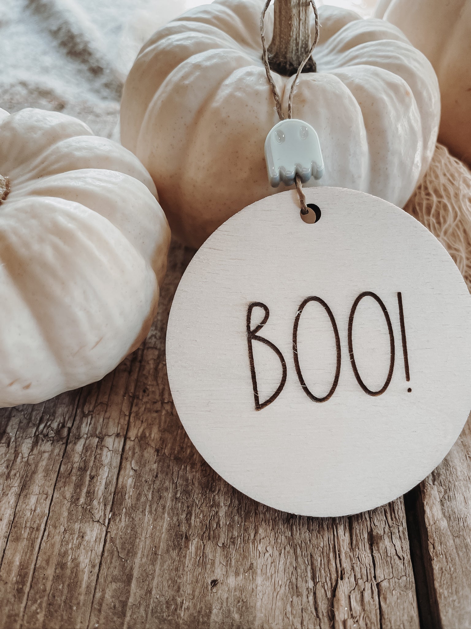Schlichte Holzanhänger mit dem Schriftzug Boo! für deine nächste Halloween-Party oder für deine diesjährige Halloween-Dekoration.