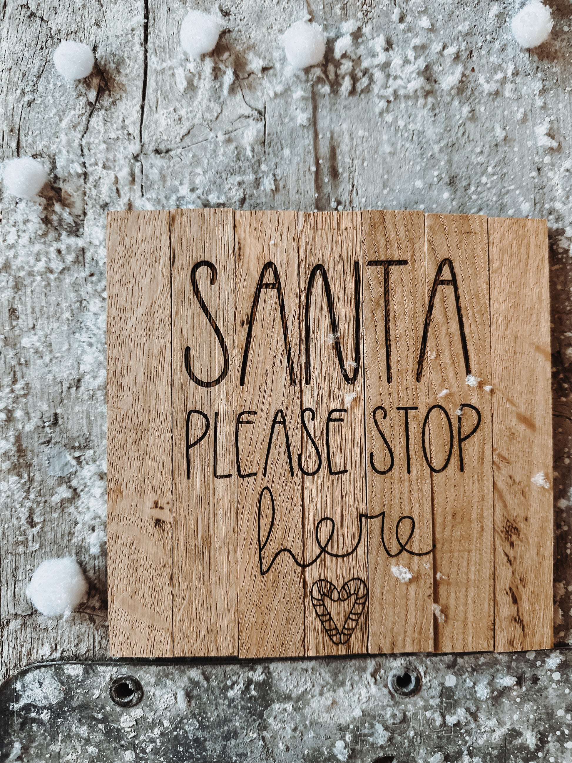 Graviertes Holzschild aus easy sticks mit dem Schriftzug „Santa please stop here“.