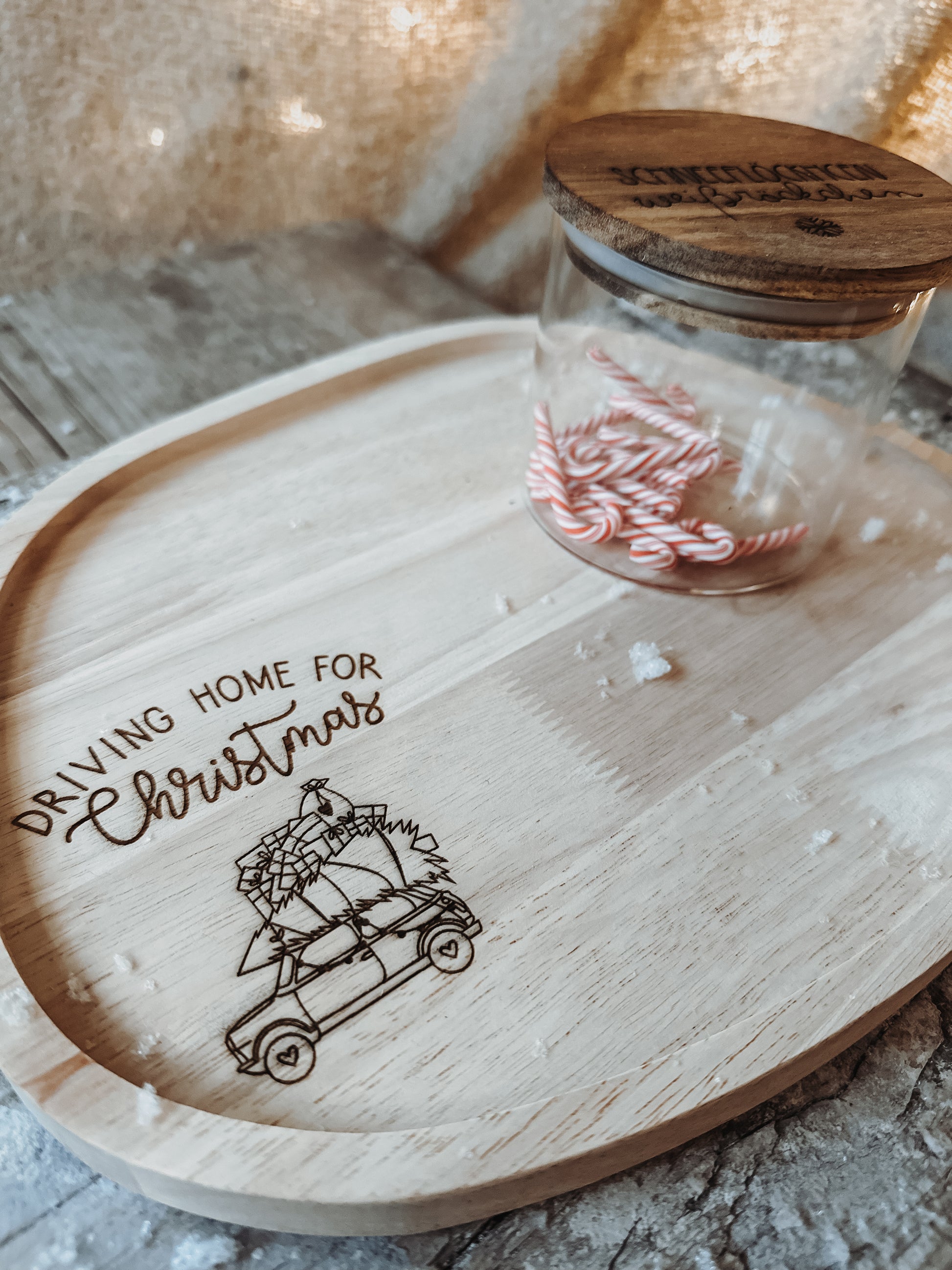 Schönes,schlichtes Holztablett mit der Gravur „driving home for Christmas“