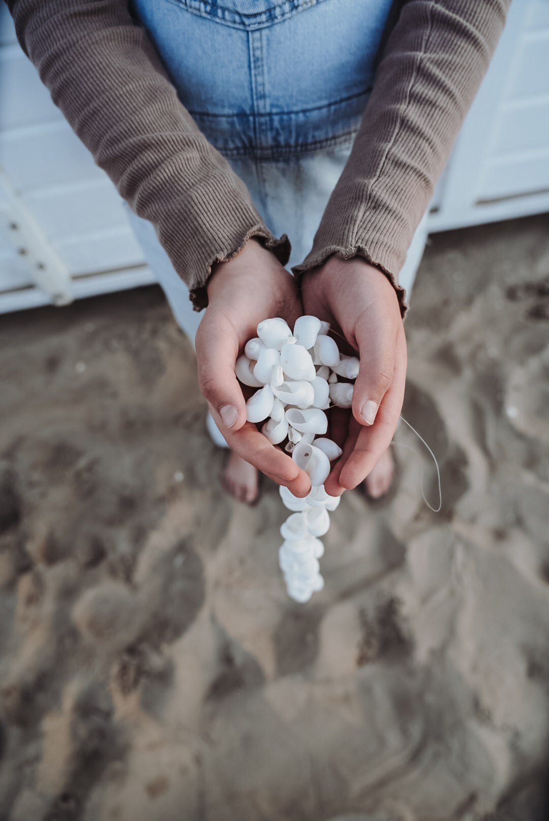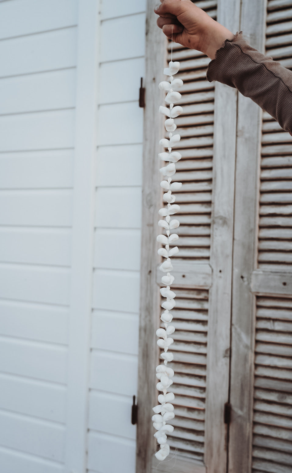 Die wunderschöne Dekorationskette besteht aus zarten, weißen Muscheln und kann sowohl gehängt als auch zur Verschönerung eines Kerzentellers verwendet werden.