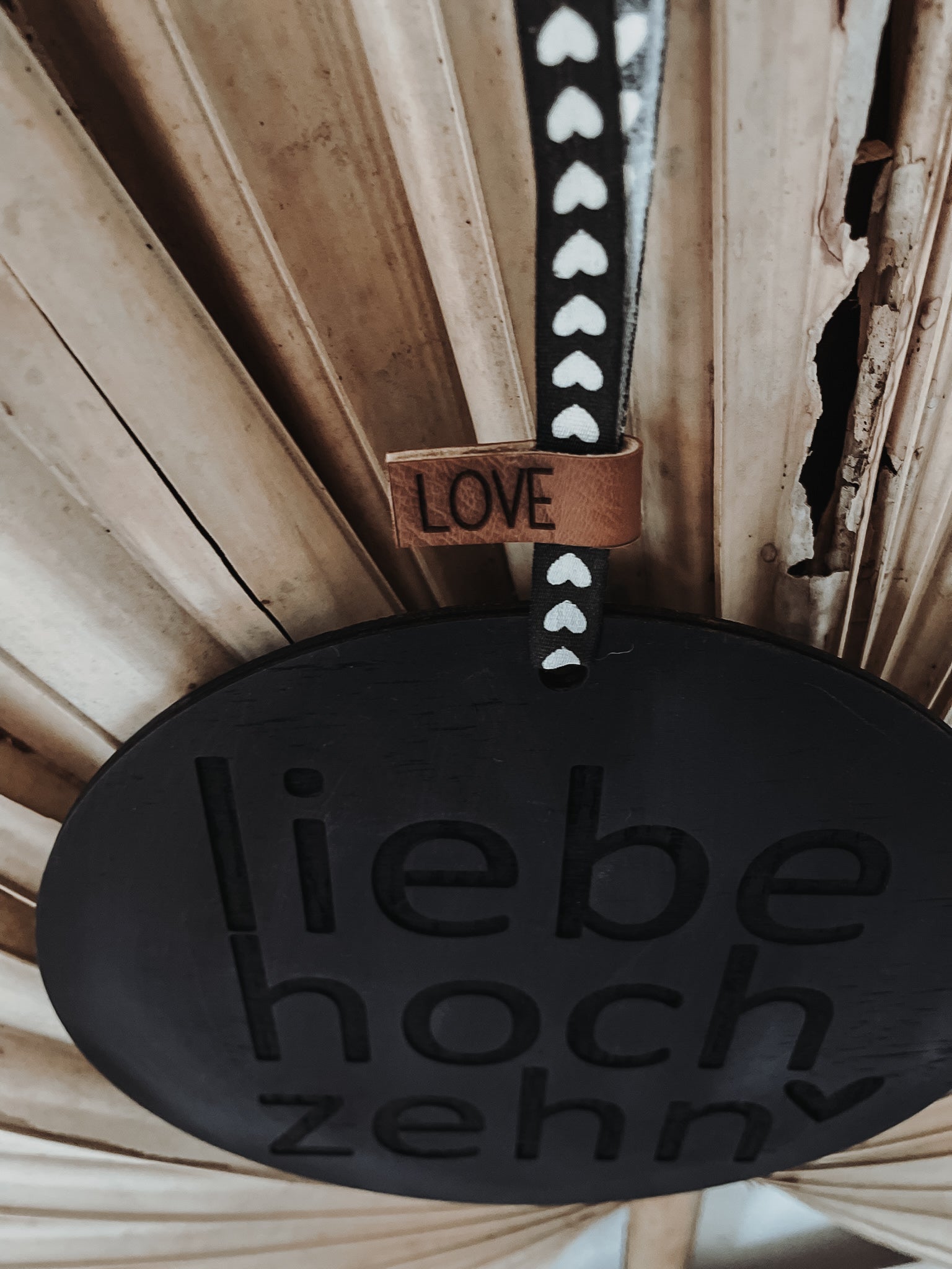 Diese Textplatte aus Holz mit dem eingravierten Schriftzug 'liebe hoch zehn' ist eine schlichte und doch besondere Art, einem ganz besonderen Menschen zu zeigen, wie gut ihr zusammenpasst. Perfekt zum Aufhängen als Dekoration oder als persönliches Geschenk.