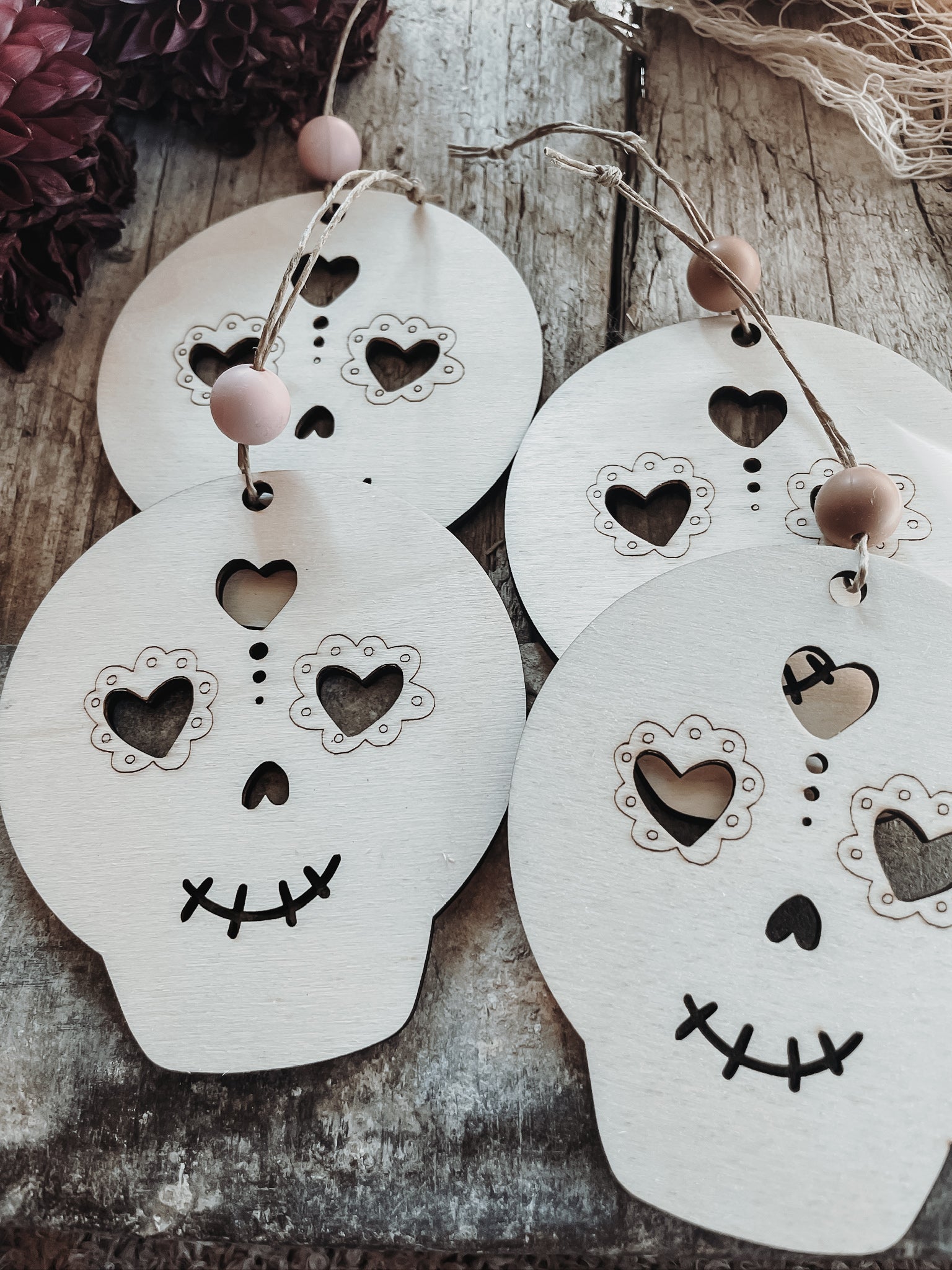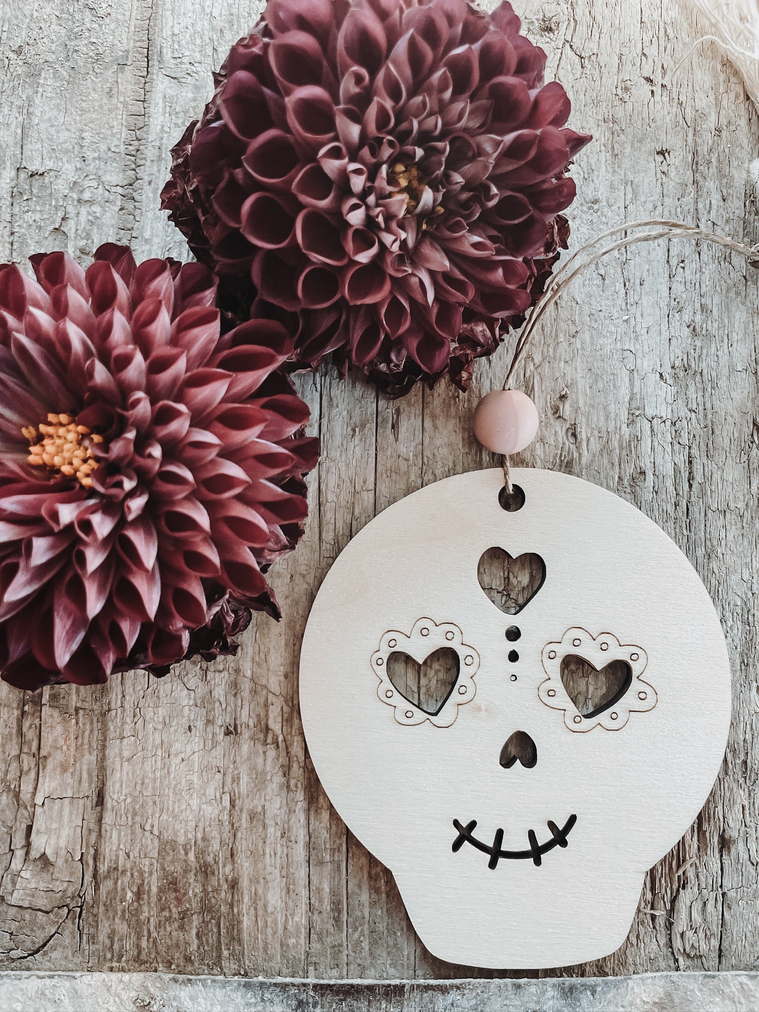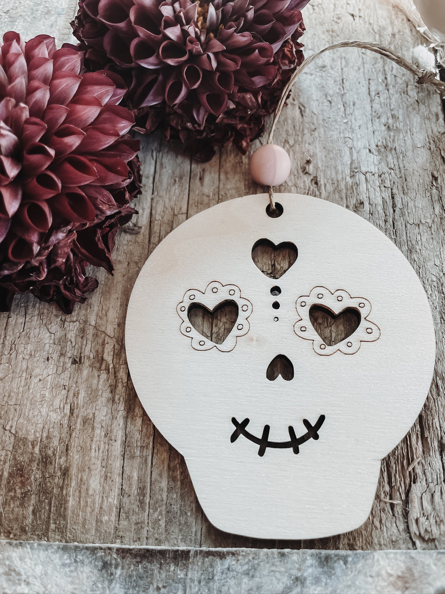 Schlichte Holzanhänger in Form eines Totenkopfes,im Stil des Dia de los Muertos, für deine nächste Halloween-Party oder für deine diesjährige Halloween-Dekoration.