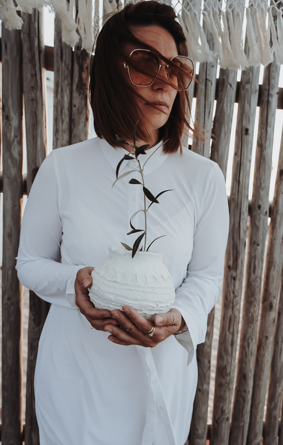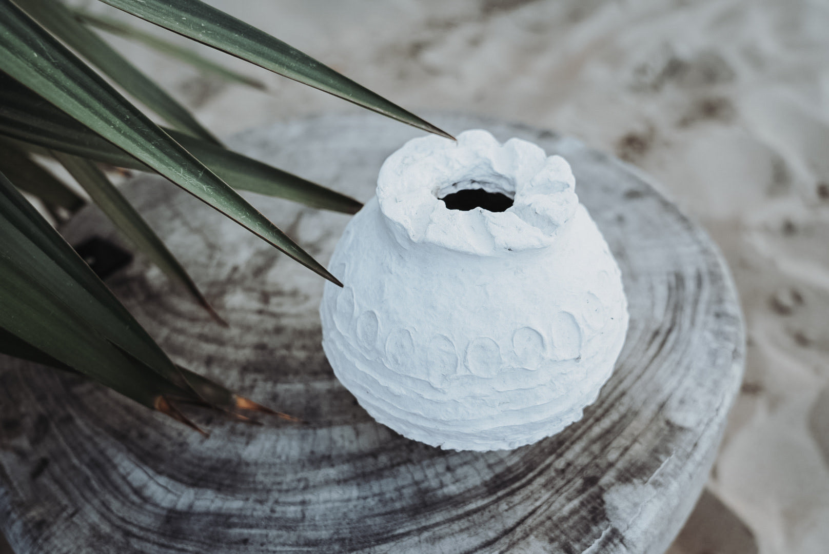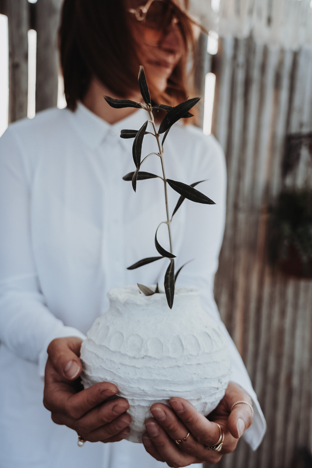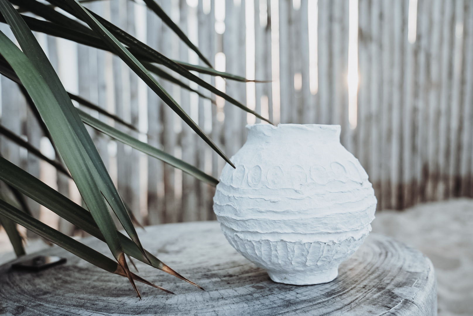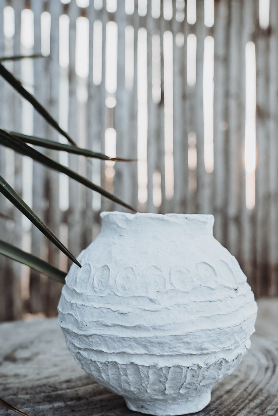 Die Pappmaché-Vase Alex ist nicht nur ein echtes Unikat, sondern auch umweltfreundlich aus recyceltem Material handgefertigt. Erhältlich in den Farben muschelweiß und palmblattgrün.
